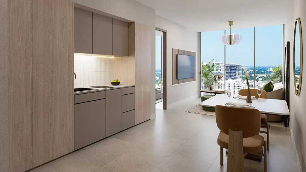 This project, developed by Grupo T&C, will feature 600 fully finished and furnished residences, with interiors crafted by Adriana Hoyos Design Studio. The residences, ranging from studios to two-bedroom units, are equipped with the latest in technology and amenities. Notable features include nine-foot-high ceilings, floor-to-ceiling windows, and private terraces in select units, providing a seamless transition between indoor and outdoor spaces.