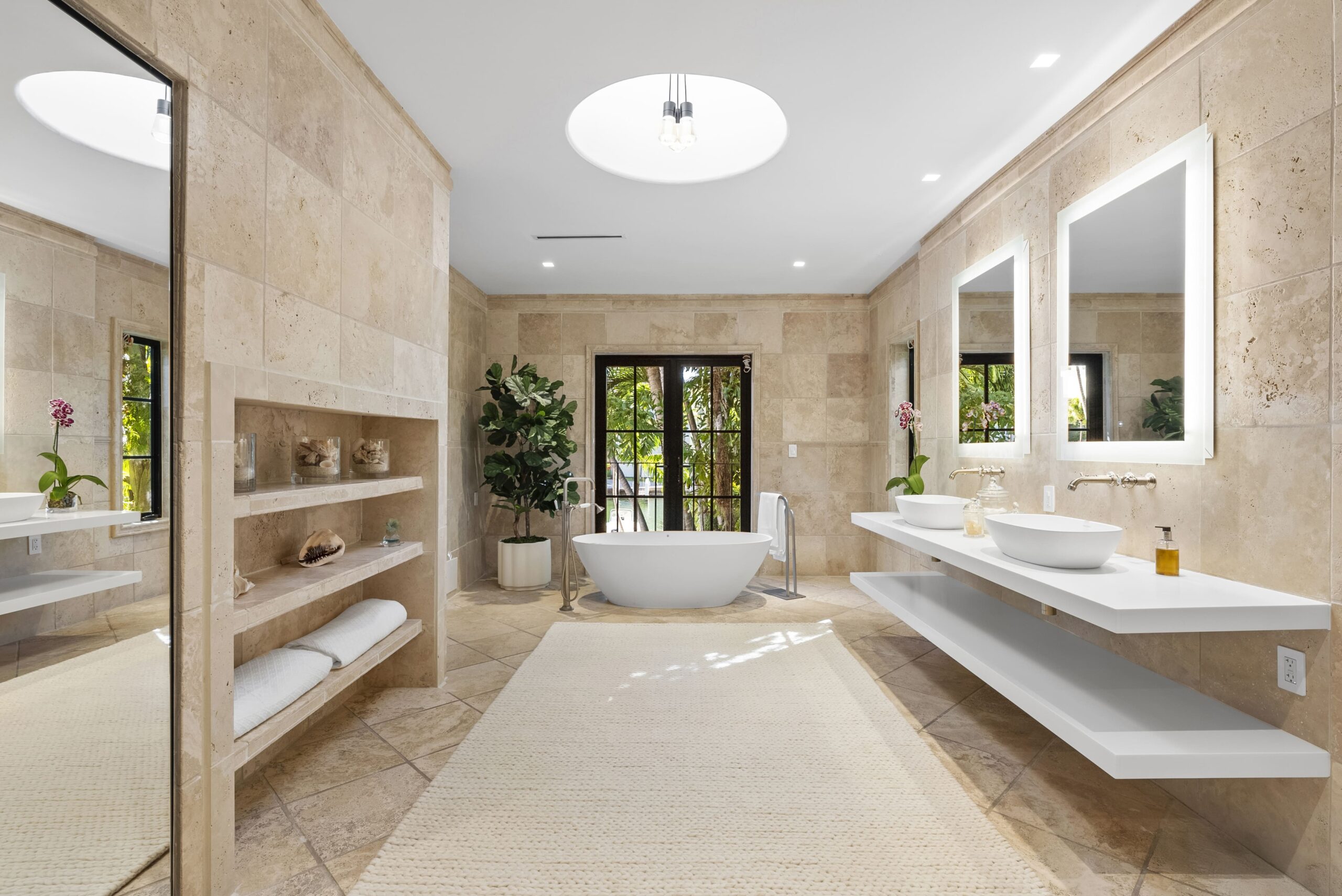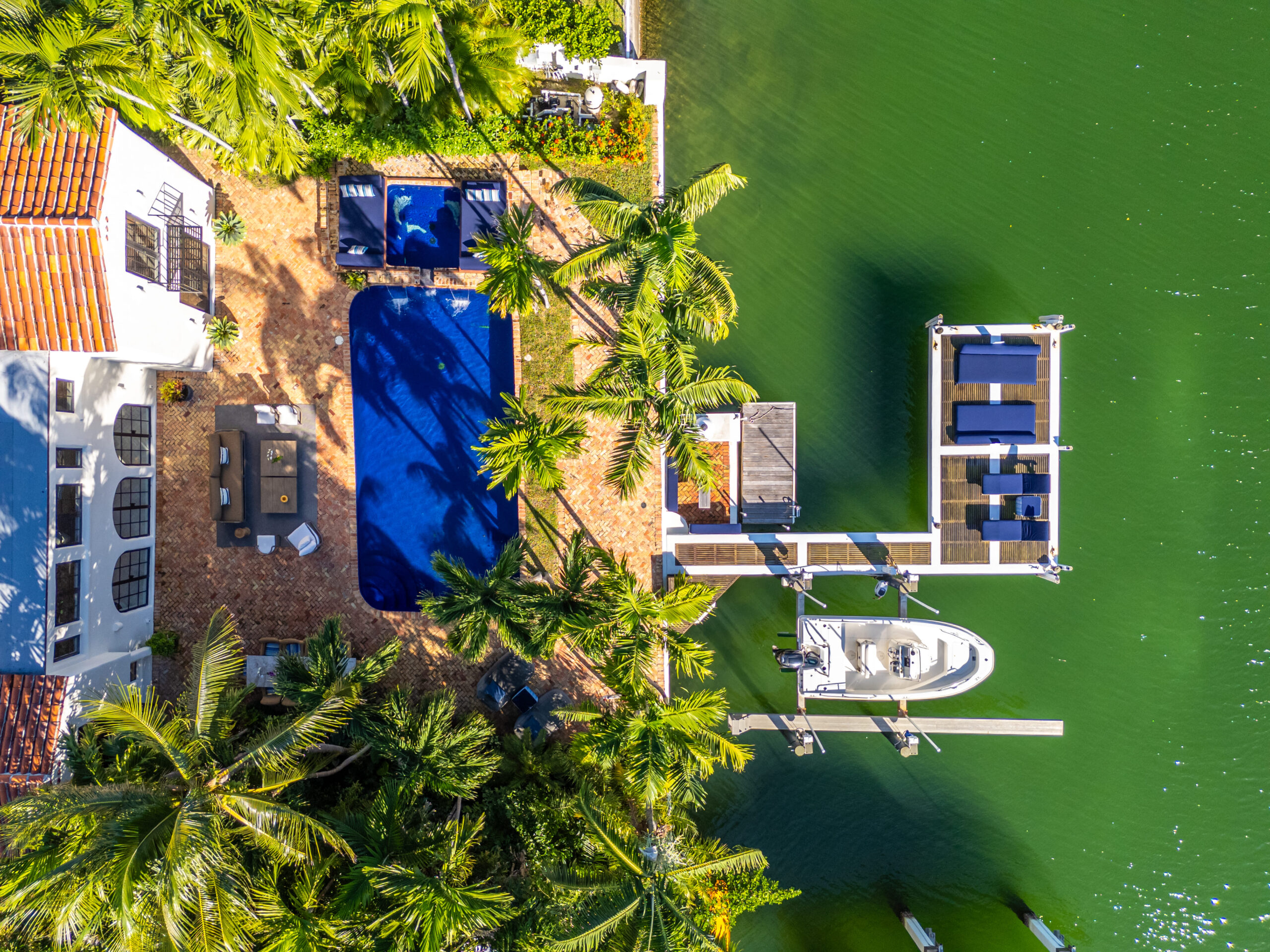 Outdoors, the property boasts 75 feet of water frontage with a pool, spa, and dock that accommodates up to three boats, featuring a 20,000-pound lift with direct bay access and no fixed bridges. For the ultimate in luxury convenience, owners also have access to land a helicopter on the water via an ILandMiami floating landing dock behind the home, available for an additional fee.