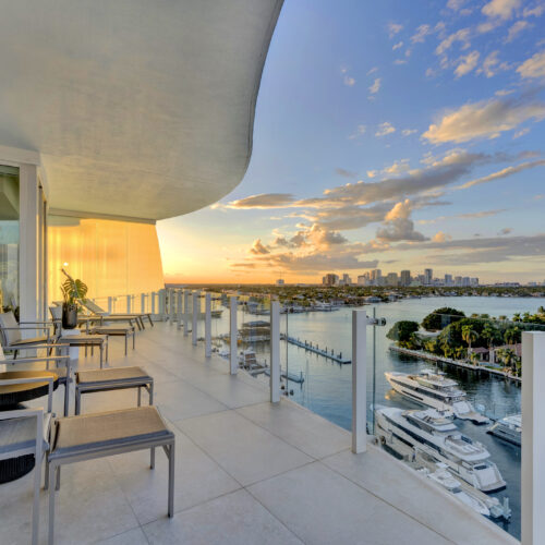 Offering a diverse selection of residences, layouts include studios, one-bedroom, one-bedroom plus den, two-bedroom, and three-bedroom configurations ranging in size from 510 to 1,730 square feet, and a private collection of penthouses averaging 3,150 square feet. Timeless and functional interiors by Meyer Davis Studio pay homage to the distinctive aesthetic established by Proper Hotels, showcasing visually rich interiors with effortless sophistication and one-of-a-kind touches. Residences feature expansive open floor plans with ceilings soaring above 10 feet, expansive wrap-around terraces with seamless glass railings, and energy-efficient, floor-to-ceiling windows and sliding doors. The fully finished units are outfitted with imported wood porcelain flooring and designer kitchens featuring Italian cabinetry, quartz countertops, brass pull details, and top-of-the-line Sub-Zero and Wolf appliances. Master bathrooms are an indulgent retreat, with glass-enclosed double showers, Hansgrohe brass fixtures, and signature Jade ceramic walls. The three-bedroom and penthouse residences incorporate wet rooms with double showers and freestanding bathtubs. Penthouses feature 20-foot double-height corner living rooms in four- and five-bedroom layouts with private rooftop terraces, gardens, and private pools. Prices range from low $700,000’s to $2.7 million, plus penthouses, with expected completion in 2028.